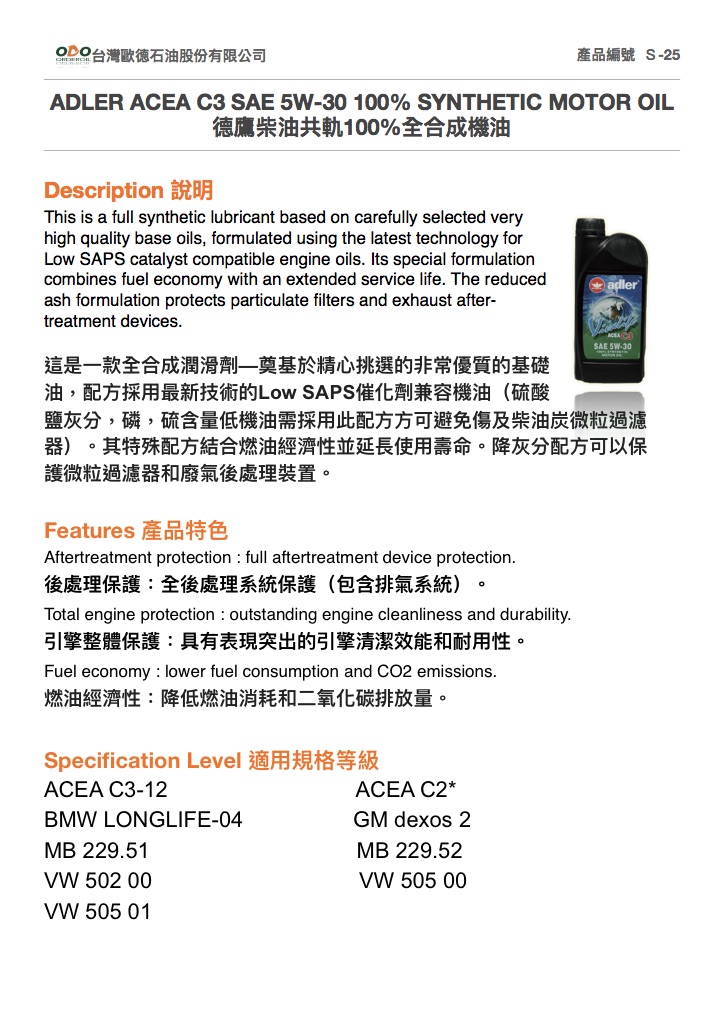 S-25 Adler 5W30 C3 全合成機油(汽柴油共用)