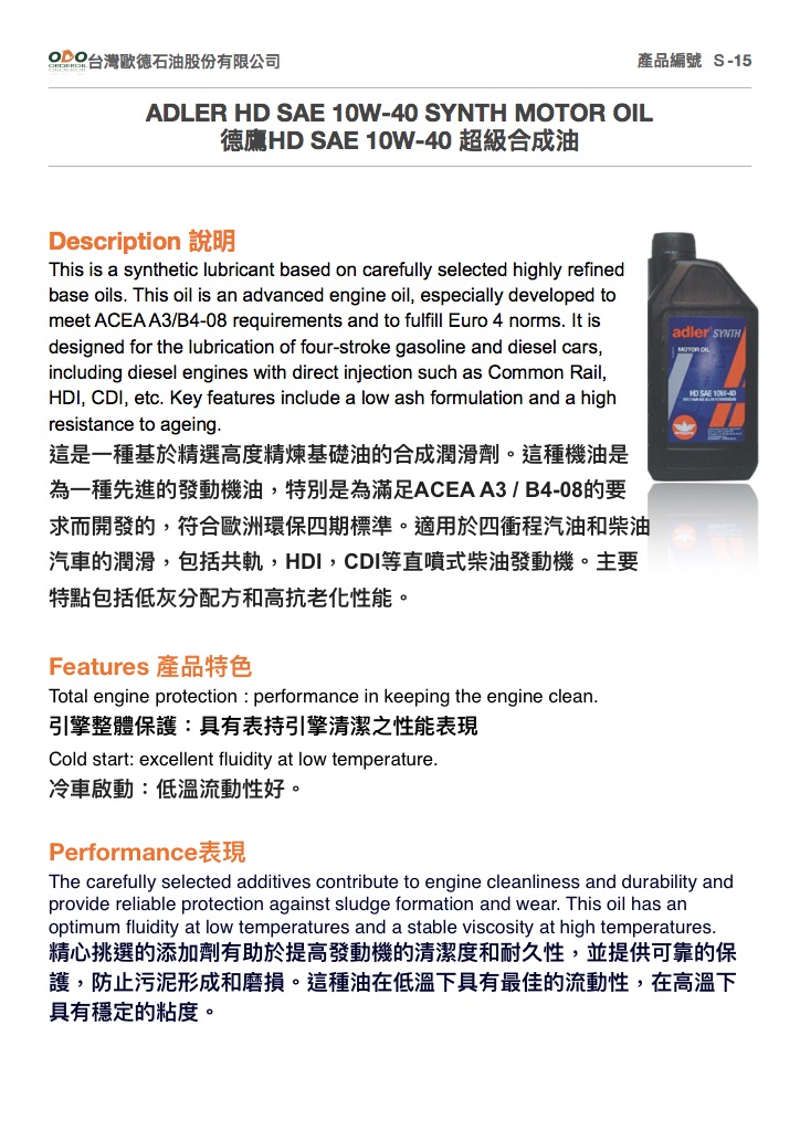 S-15 Adler 10W40 HD 超級合成機油